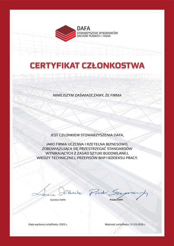 Firmy zrzeszone w Stowarzyszeniu DAFA to liderzy rynku dachów płaskich i fasad. Ich pozycja wynika nie tylko z wieloletniego doświadczenia, lecz przede wszystkim z przestrzegania najwyższych standardów jakości i etyki biznesowej.