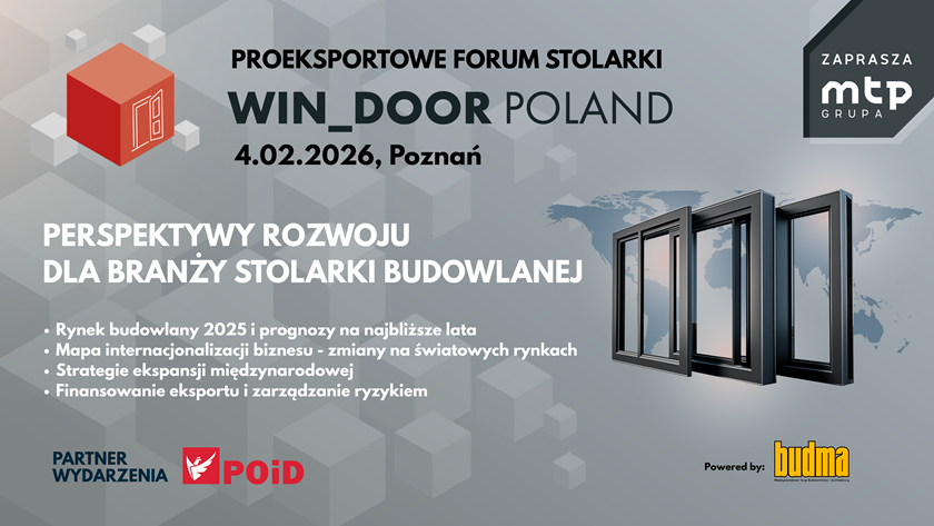 Rynek stolarki budowlanej znajduje się dziś na etapie, w którym przewagę konkurencyjną buduje nie tylko jakość produktów, lecz przede wszystkim zdolność do świadomego planowania ekspansji oraz kompleksowego rozumienia sytuacji gospodarczej na rynkach zagranicznych. Od Ogólnopolskiego Forum Stolarki po VIP Stolarka temat eksportu interesuje i porusza branżę. Teraz pojawia się platforma, która łączy merytorykę, praktyczne narzędzia i kontakt z partnerami instytucjonalnymi. Mowa o Proeksportowym Forum Stolarki WIN_DOOR POLAND, organizowanym 4 lutego 2026 r. podczas targów BUDMA w Poznaniu.