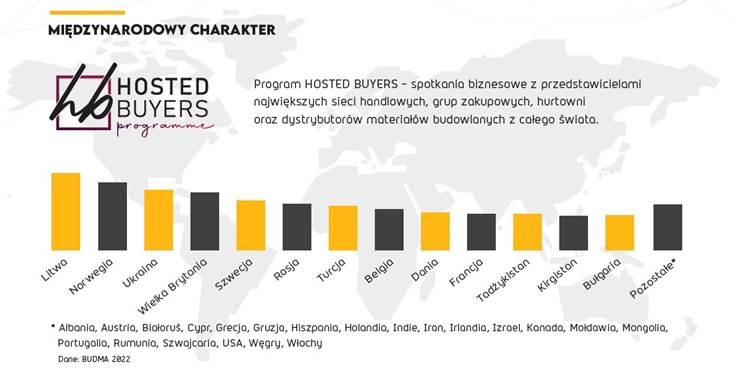 Realizacja Programu Hosted Buyers stawia mocno na działania proeksportowe związane z rynkami i klientami z zagranicy, co umożliwia prowadzenie interesów z najlepszymi profesjonalistami z branży, niezależnie od miejsca ich działalności na świecie. Korzystanie z doświadczenia przedsiębiorców od lat działających prężnie na lokalnym i międzynarodowym rynku to ogromny atut BUDMY. To właśnie targi zapewniają przestrzeń do rozwoju oraz oferują środowisko, w którym firmy budowlane i te działające w temacie wykończenia wnętrz mogą przejść na wyższy poziom i osiągnąć optymalną wydajność.