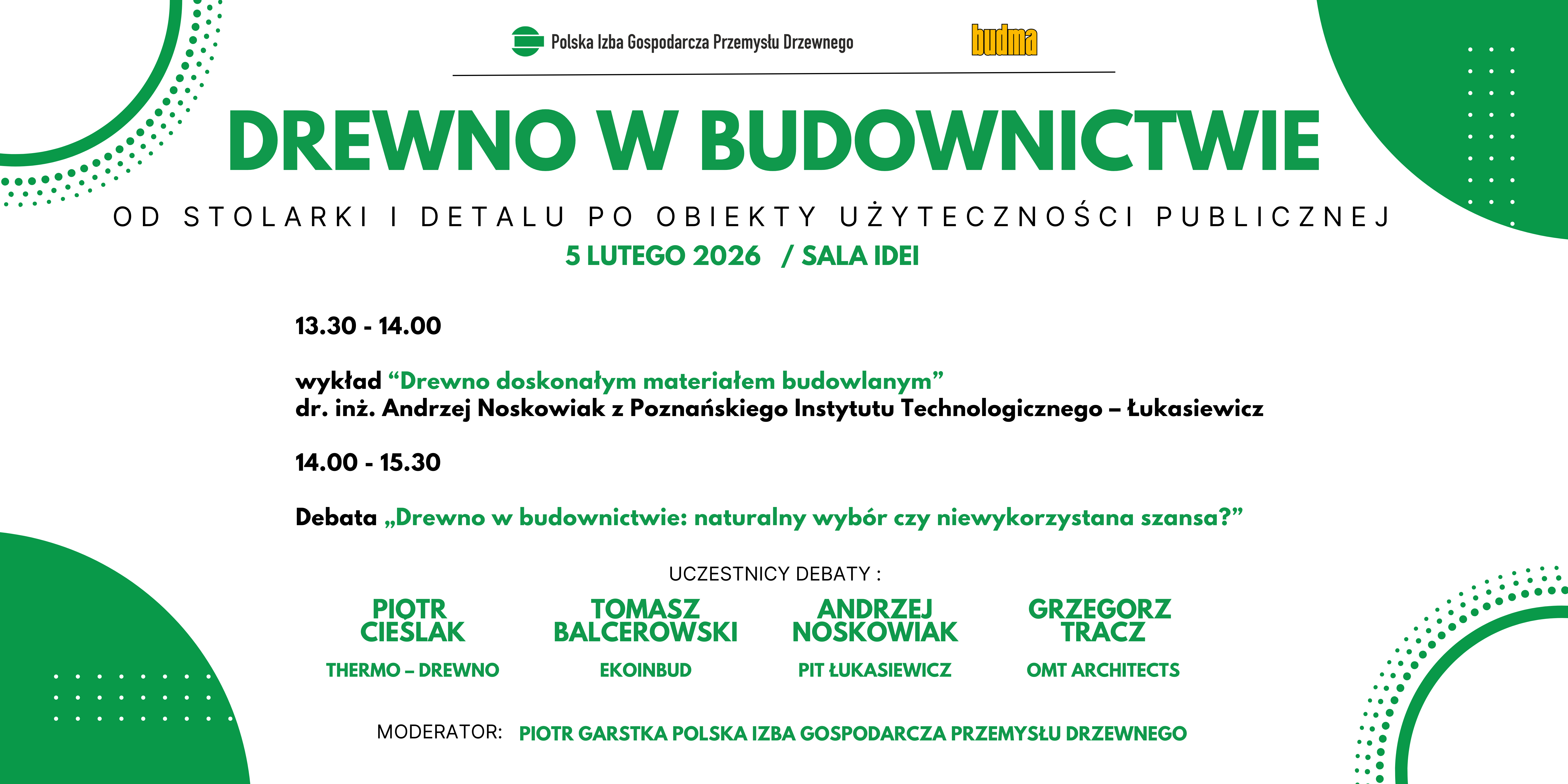 Panel dyskusyjno-ekspercki pt. „Drewno w budownictwie – od stolarki i detalu po obiekty użyteczności publicznej” Czy w Polsce wciąż budujemy zbyt mało z drewna? Czy krajowe przepisy nadążają za rozwojem nowoczesnych technologii drewnianych? Jak przekonać inwestorów i użytkowników, że drewno to nie tylko tradycja, ale pełnowartościowy, bezpieczny i trwały materiał budowlany przyszłości? Na te i wiele innych pytań spróbują odpowiedzieć eksperci podczas wyjątkowego wydarzenia organizowanego przez Polską Izbę Gospodarczą Przemysłu Drzewnego w ramach targów BUDMA 2026 w Poznaniu.