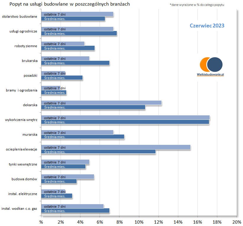 W czerwcu w branży budowlanej można dostrzec pozytywne znaki. Prawdopodobnie to najlepszy okres nowych inwestycji od stycznia bieżącego roku. Istotnym faktem jest również dynamiczny wzrost sektora prywatnej budowy domów. Choć nie osiągnął jeszcze poziomu sprzed szczytu w tym roku (styczeń-marzec), liczba zamówień jest o 17% wyższa niż w analogicznym okresie ubiegłego roku. Podsumowując, jeśli niedawno mówiliśmy o stabilizacji na rynku budowy domów, to teraz możemy mówić o stopniowej poprawie. Przewiduje się ogólnie poprawę w drugiej połowie roku, z uwagi na nadchodzącą równowagę na rynku oraz decyzje osób, które wstrzymywały się z budową w ostatnim, niestabilnym roku. Prognozy sugerują, że jeżeli nie wystąpią żadne nieprzewidziane okoliczności, takie zjawisko powinno nastąpić w styczniu przyszłego roku...