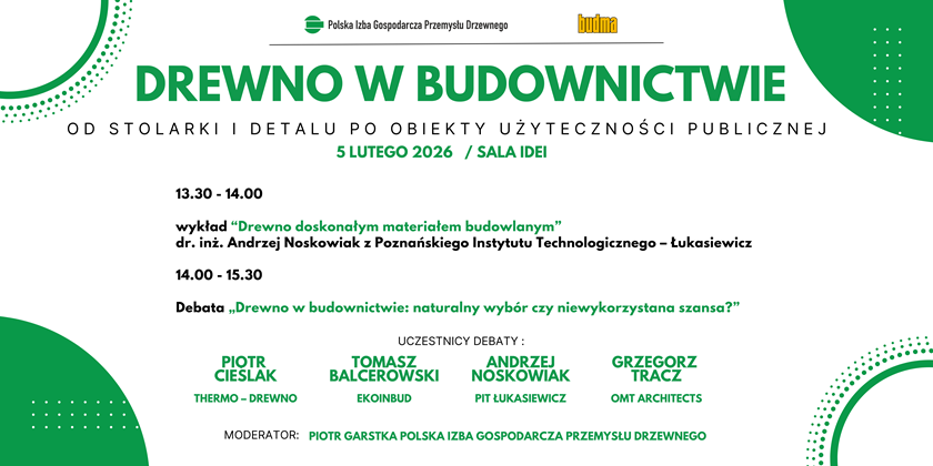 Czy w Polsce wciąż budujemy zbyt mało z drewna? Czy krajowe przepisy nadążają za rozwojem nowoczesnych technologii drewnianych? Jak przekonać inwestorów i użytkowników, że drewno to nie tylko tradycja, ale pełnowartościowy, bezpieczny i trwały materiał budowlany przyszłości? Na te i wiele innych pytań spróbują odpowiedzieć eksperci podczas wyjątkowego wydarzenia organizowanego przez Polską Izbę Gospodarczą Przemysłu Drzewnego w ramach targów BUDMA 2026 w Poznaniu.