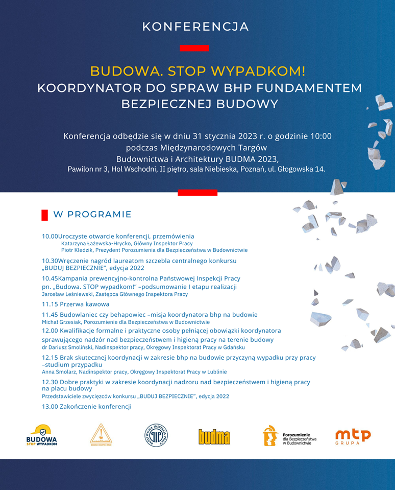 Ograniczanie skali zagrożeń wypadkowych na polskich budowach jest jednym z najważniejszych zadań, na których od lat koncentruje swoje działania inspekcja pracy. Dlatego w ramach kampanii w dniu 31 stycznia 2023 r. o godz. 10:00, w Sali Niebieskiej, (Pawilon 3, Hol wschodni, II piętro) Targów BUDMA odbędzie się konferencja Państwowej Inspekcji Pracy pn. „Budowa. STOP wypadkom! – koordynator ds. bhp fundamentem bezpiecznej budowy”. Zaprezentowane będą doświadczenia z kontroli Państwowej Inspekcji Pracy w budownictwie oraz podsumowanie realizacji pierwszego roku trzyletniej kampanii społecznej. Podczas konferencji prelegenci omówią takie zagadnienia jak: rola koordynatora bhp na budowie, główne przyczyny wypadków przy pracy w sektorze budownictwa, dobre praktyki w zakresie koordynacji nadzoru nad bezpieczeństwem i higieną pracy na placu budowy.