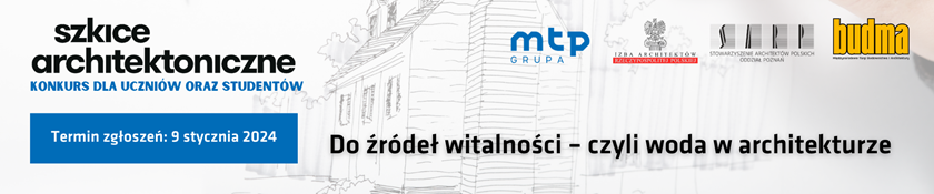 Wciąż można zgłaszać prace do konkursu „Szkice Architektoniczne”, którego organizatorem są Międzynarodowe Targi Poznańskie, a partnerami Izba Architektów RP oraz SARP Oddział Poznań. Hasło przewodnie tegorocznej odsłony projektu to: „Do źródeł witalności - czyli woda w architekturze”. Konkurs przeznaczony jest dla studentów kierunków architektonicznych oraz uczniów szkół średnich.