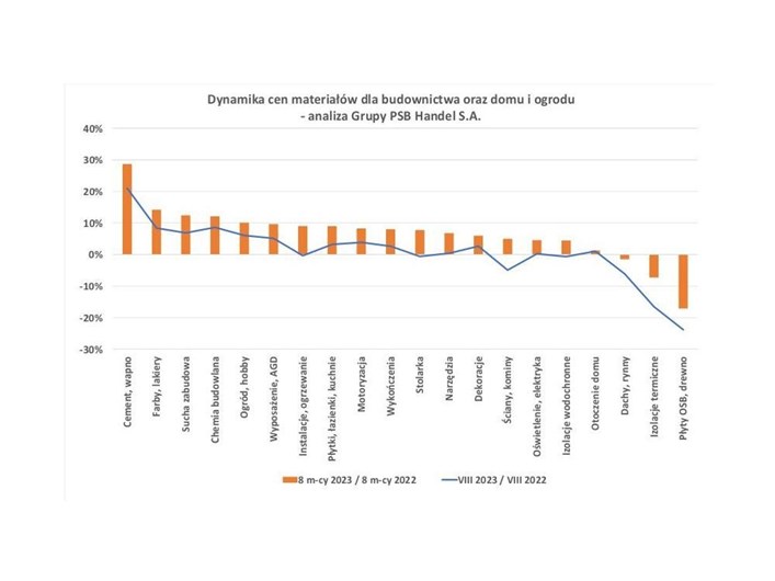 Wyjątkowo wysoki wzrost cen, wynoszący aż 21%, zarejestrowano w przypadku cementu i wapna. Ponadto, ceny produktów związanych z chemią budowlaną wzrosły o 9%, farb i lakierów o 8%, a artykułów do suchej zabudowy o 7%. Kategorie związane z ogrodem i hobby zanotowały wzrost cen o 6%. Ponadto, ceny płytek, produktów łazienkowych i kuchennych wzrosły o 3%, a także odnotowano wzrosty w dziedzinach dekoracji (3%), wykończeń (3%), otoczenia domu (1%), narzędzi (0,4%) oraz oświetlenia i elektryki (0,2%).